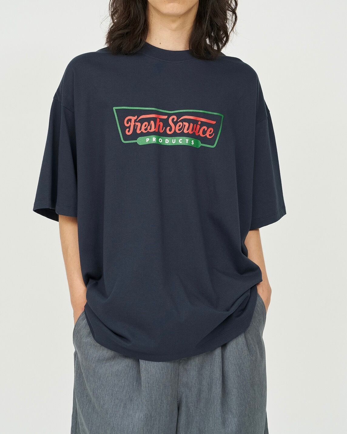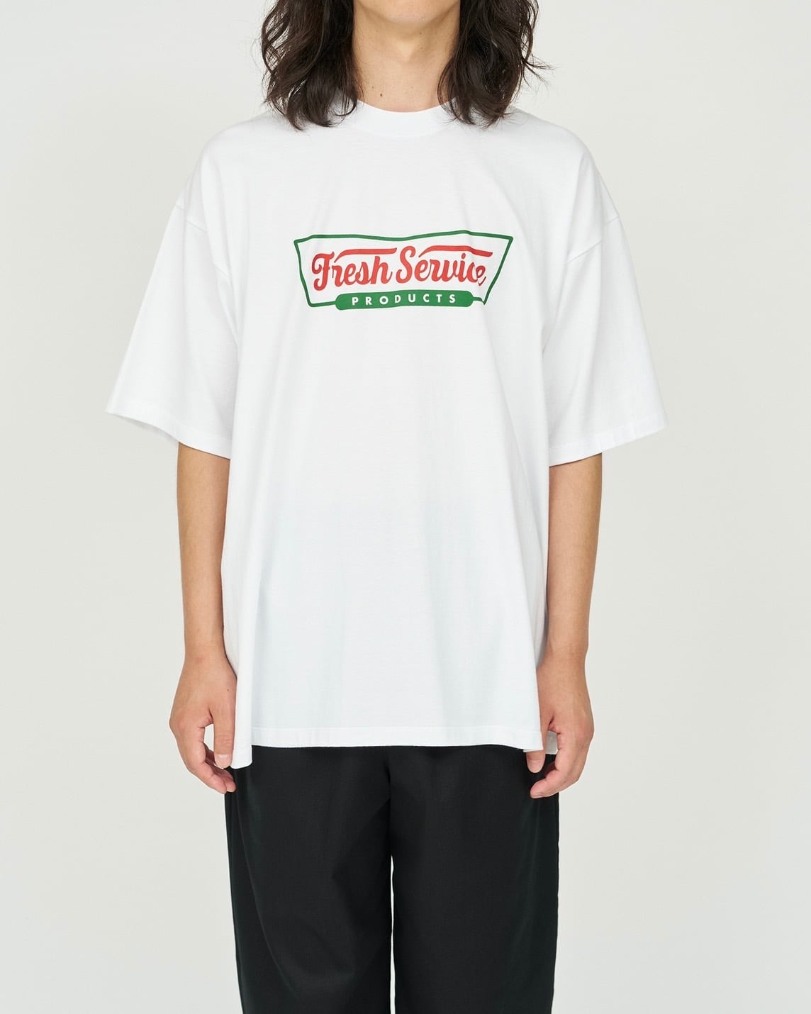 ボディはFresh Service定番のCORPORATE 2-PACK TEEを使用。ドライでざっくりした風合いのコットン生地で、脇に縫い目のない丸胴仕様。