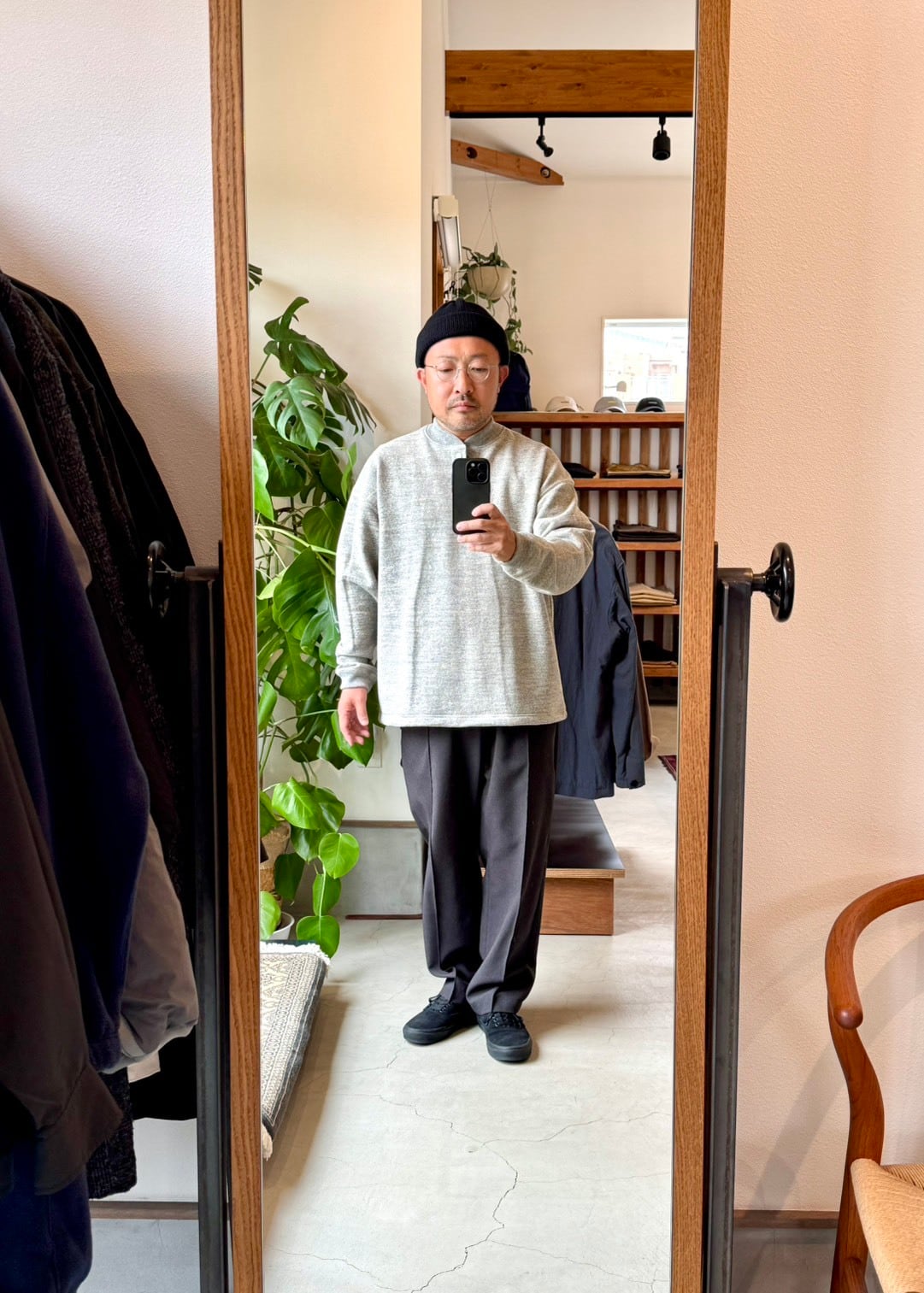 Baseballユニフォームのような首元のデザインと初秋から着用できるゆとりのあるシルエットが特徴です。