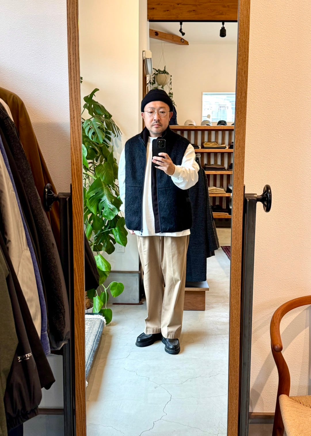 アウトドアウェアに見られるデザインを化学繊維ではなく、あえて天然繊維で表現したベスト。