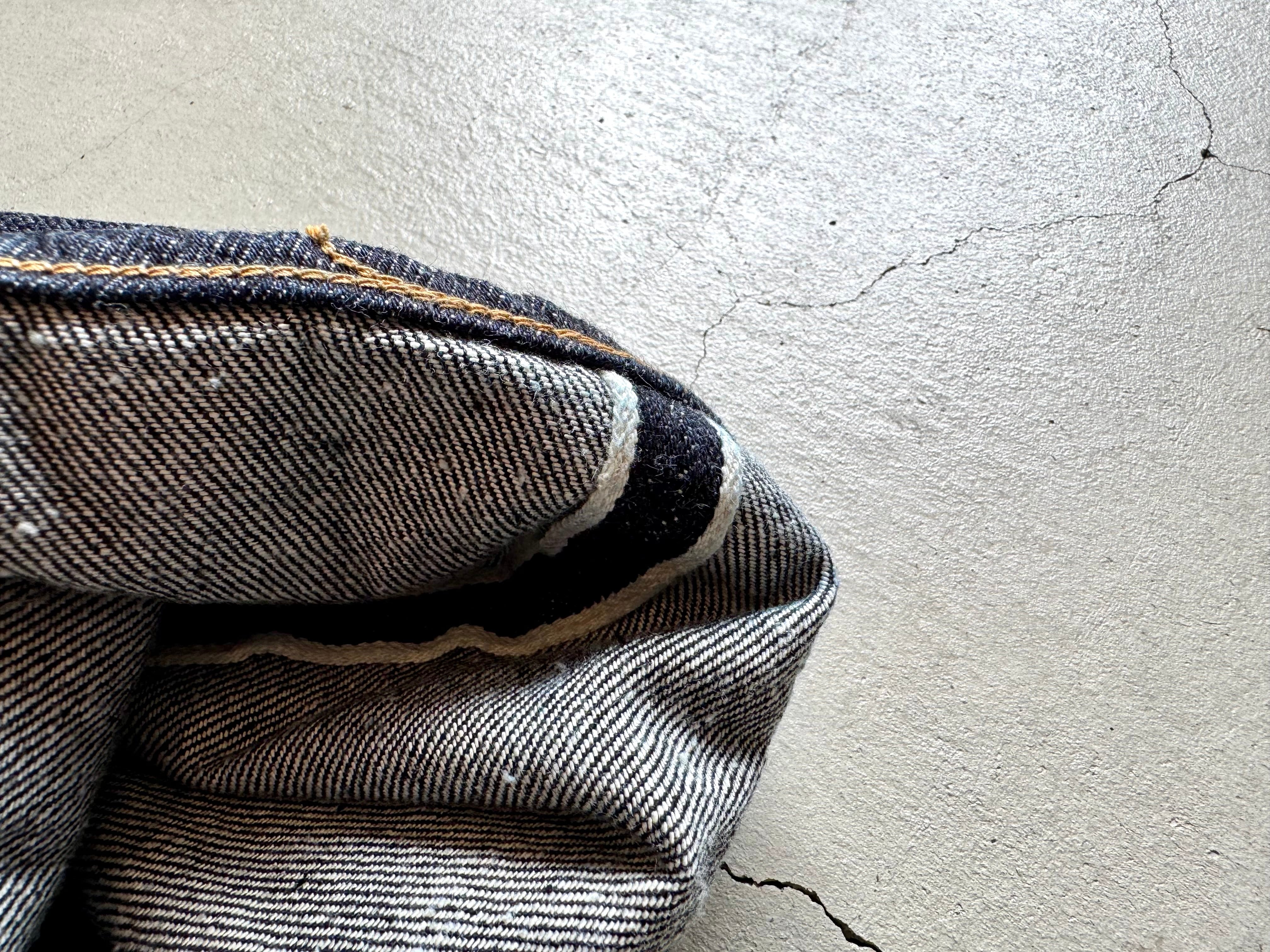 上質なサンフォーキン・コットンを原料に特殊な紡績方法を用い、ナチュラルネップ混ぜながらピュア・インディゴで染め上げた13.5ozセルビッチデニム。
