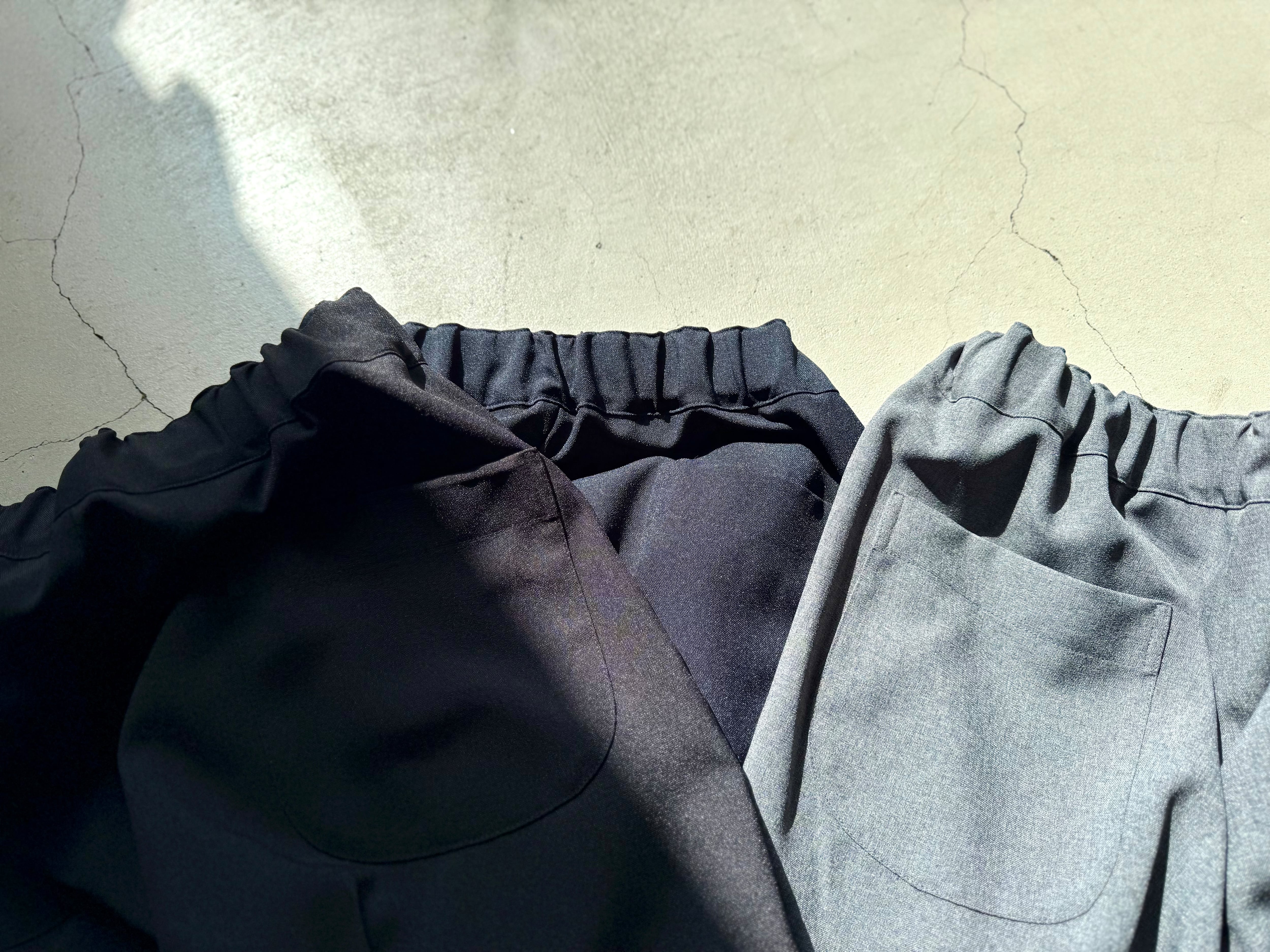 ポリエステル100%ですが、まるでトロピカルウールのようなサラッとした肌触りのイージースラックス。